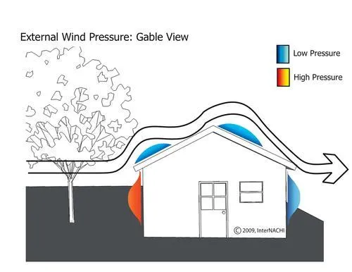 opening protection: Glass doors and windows should be replaced with impact-resistant glass. They should be structurally attached to the building in order to prevent the entire window from popping out of its frame. Sliding glass doors are especially vulnerable to flying debris due to their large expanse. Once an opening is created during a windstorm, the pressure within the house can rise high enough to cause the roof to fail in areas of low pressure. The picture to the right demonstrates how these areas of low pressure can form.